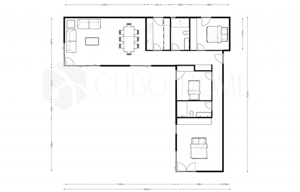Our modular house “SINGAPUR” is the most elegant and modern housing. The ideal cube house model for those families looking for large spaces in a small area.